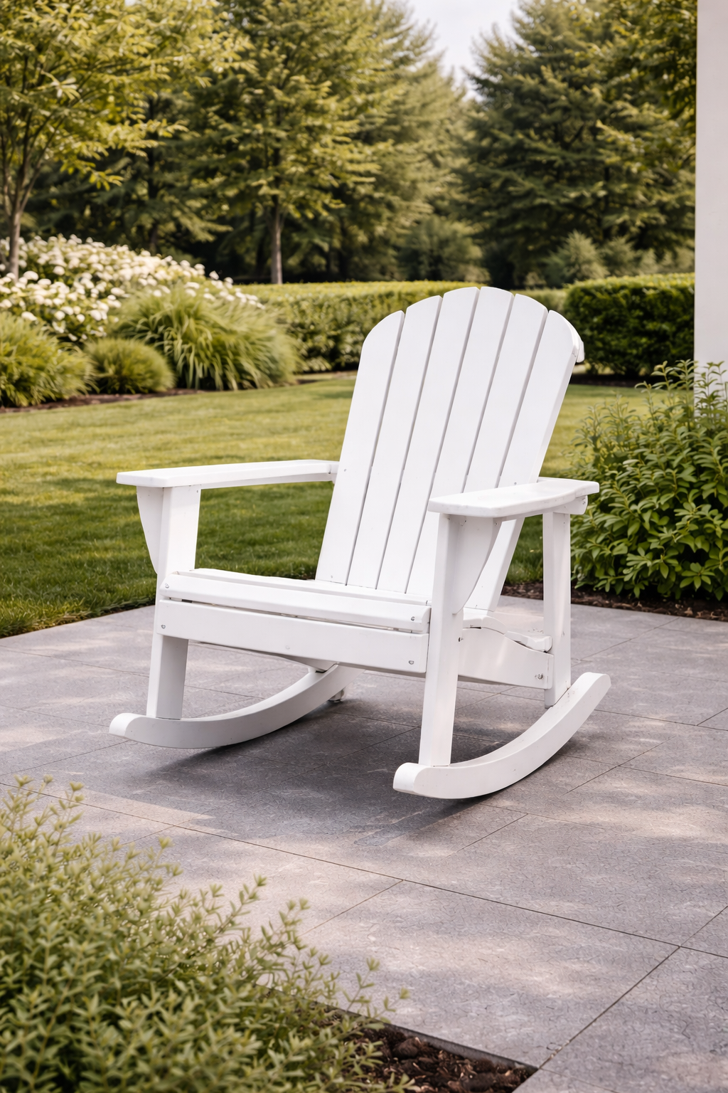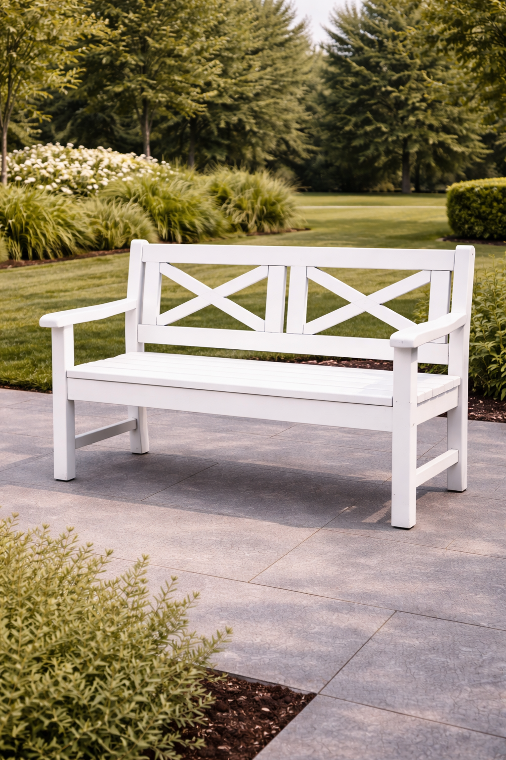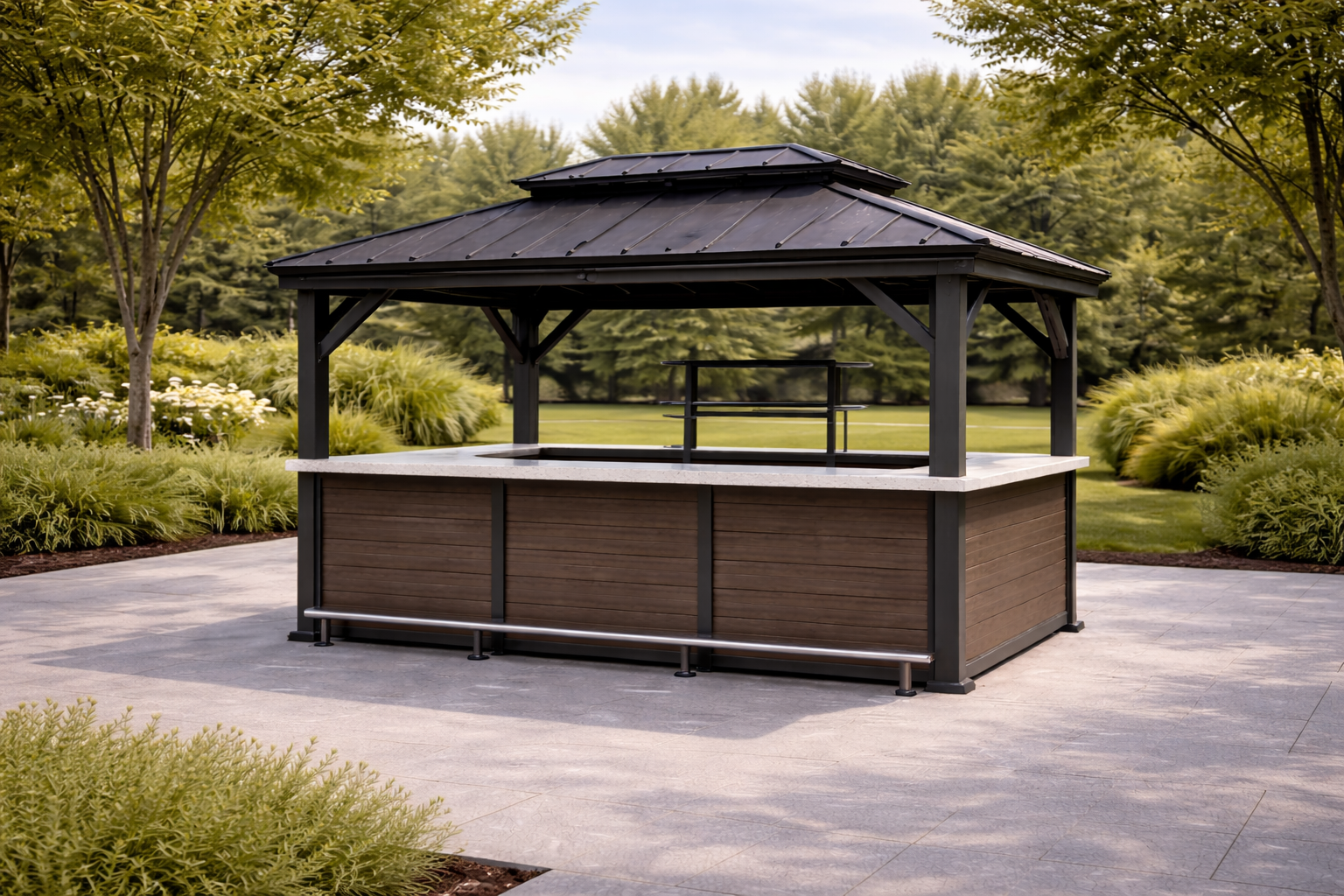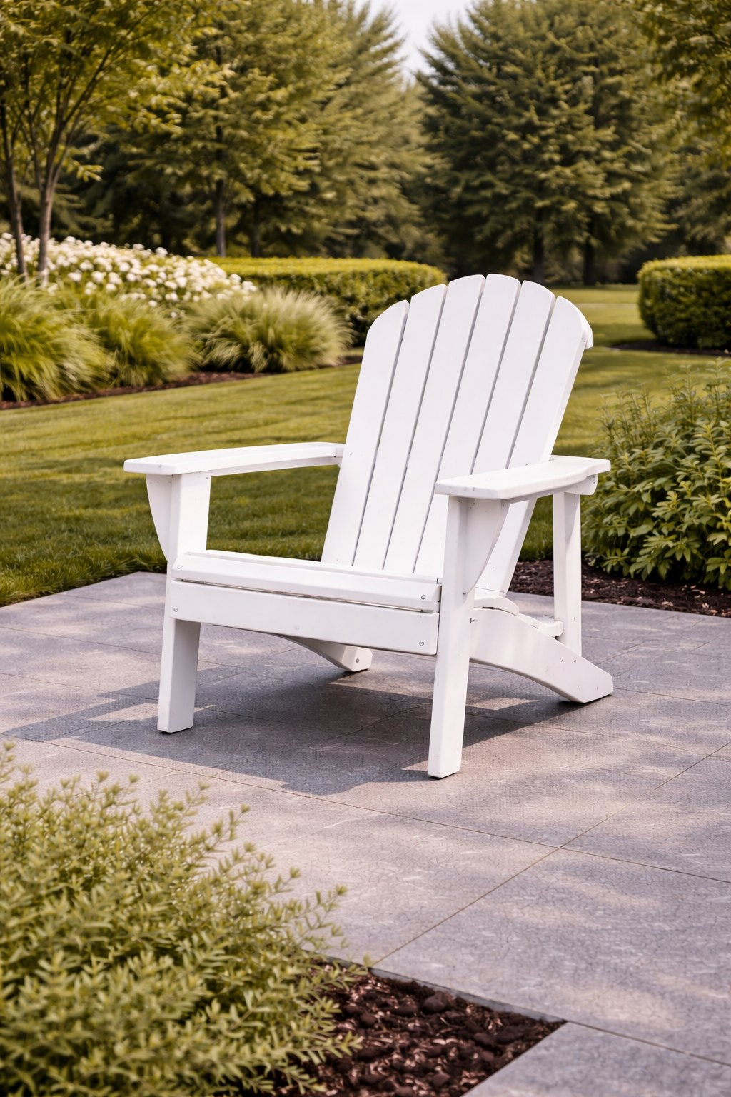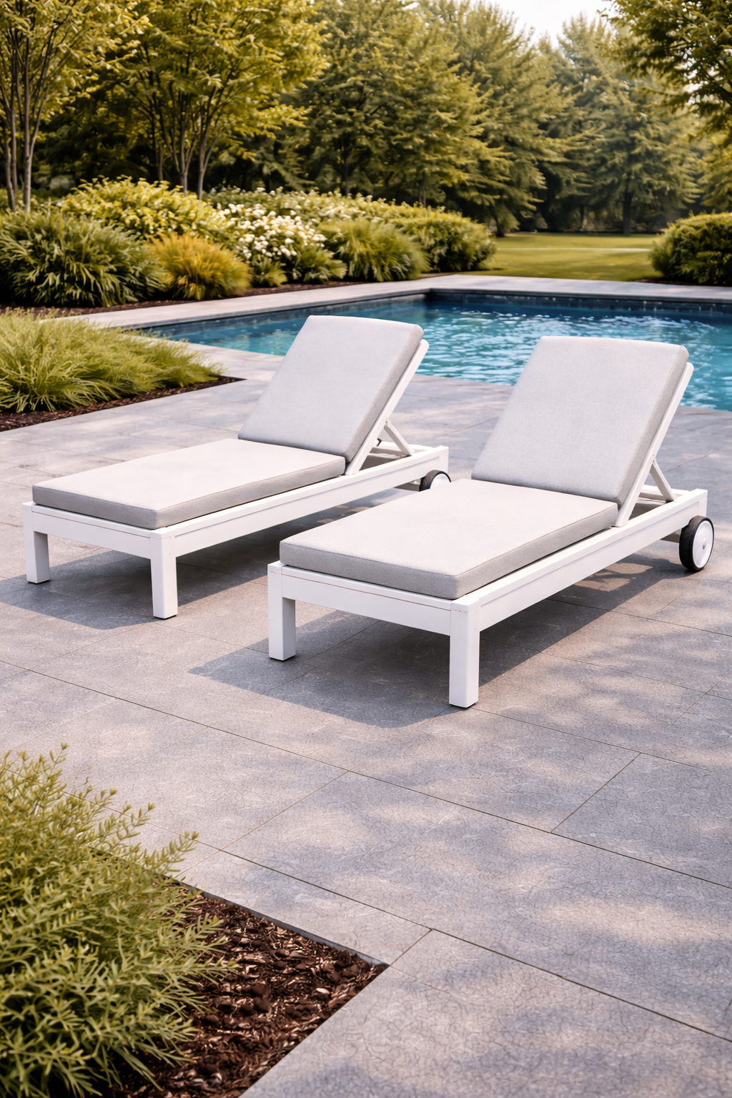 Assise permettant une position inclinée ou allongée, utilisée dans des espaces extérieurs dédiés au repos.