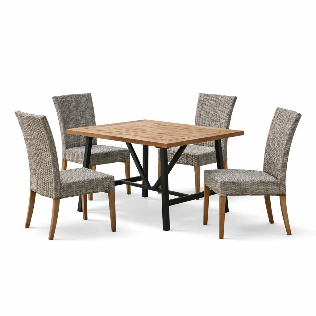 Table avec plateau en bois d'acacia et pieds en acier noir. Chaises avec structure en bois, assise et dossier en rotin tressé gris.