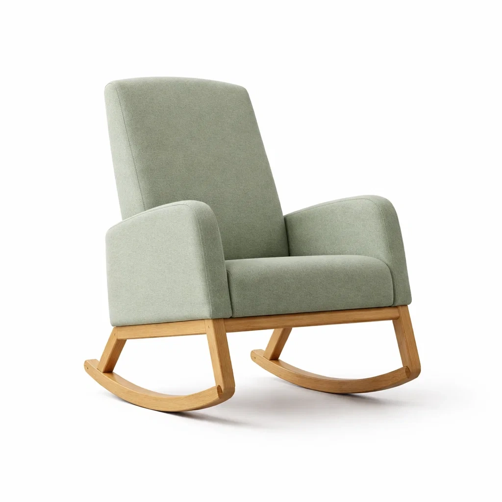 Ce fauteuil à bascule est conçu avec un revêtement en tissu polyester et une structure en bois de chêne. Il est de couleur verte.